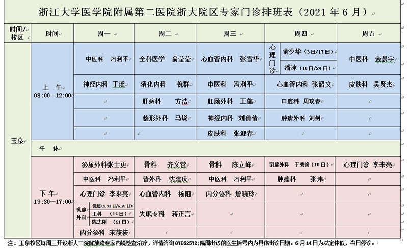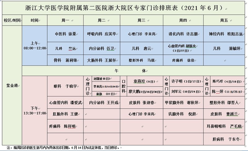 2021年6月专家门诊排班