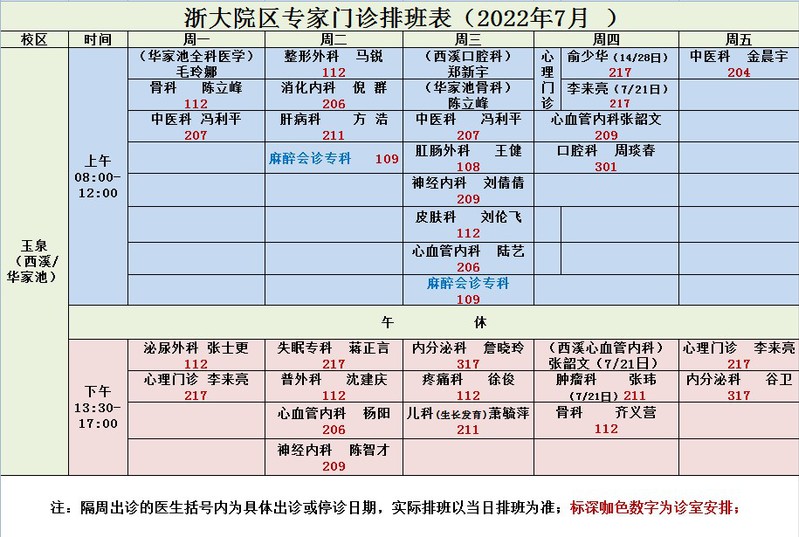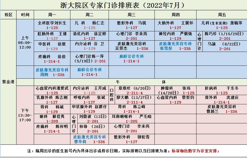 2022年7月专家门诊排班