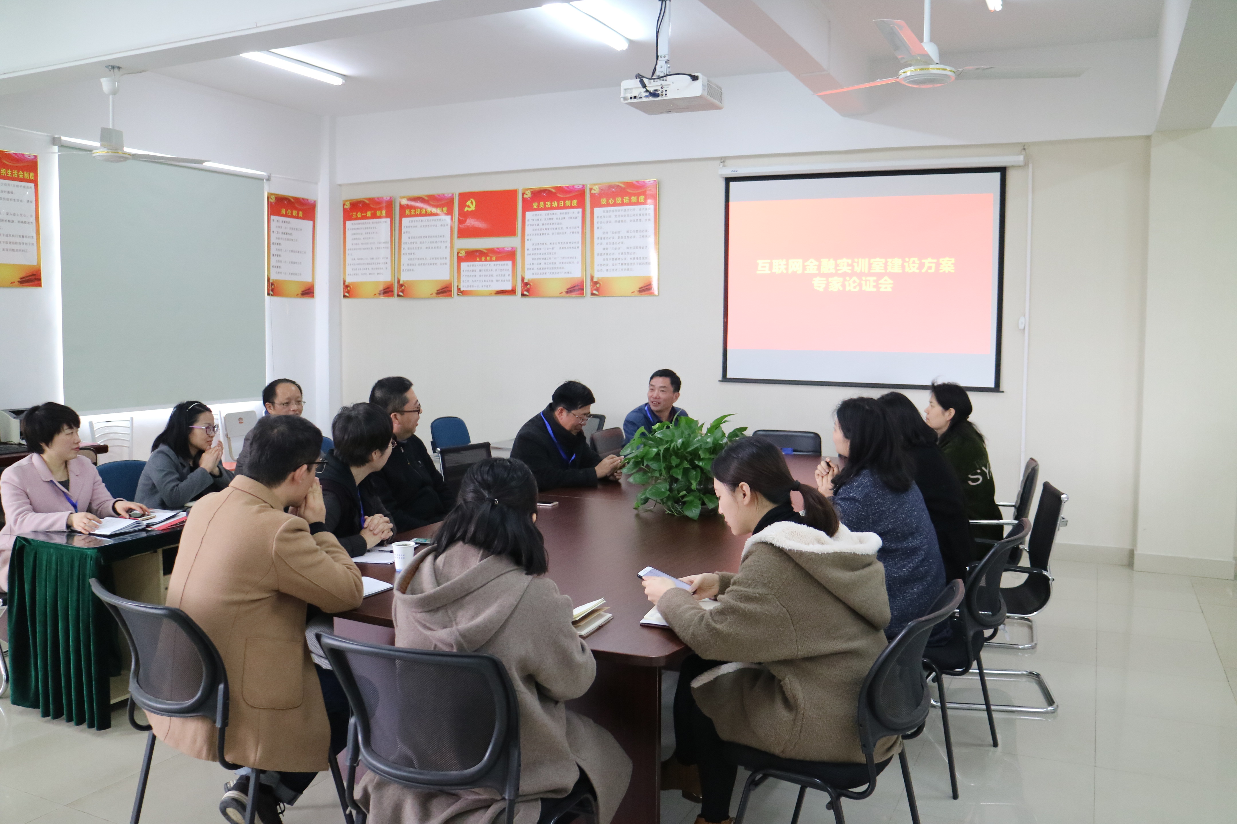 2019年3月23日上午,茂荫财金学院特别邀请中国人民银行总行中国金融培训中心主任成铨、北京财贸职业学院人事处处长武飞,就农村金融专业“现代学徒制”人才培养方案与互联网金融实训室建设方案做分析论证,茂荫财金学院副院长方春龙主持会议,副书记胡宏宣、投资与理财教研室主任周阳和其他专业教师参与了会议。