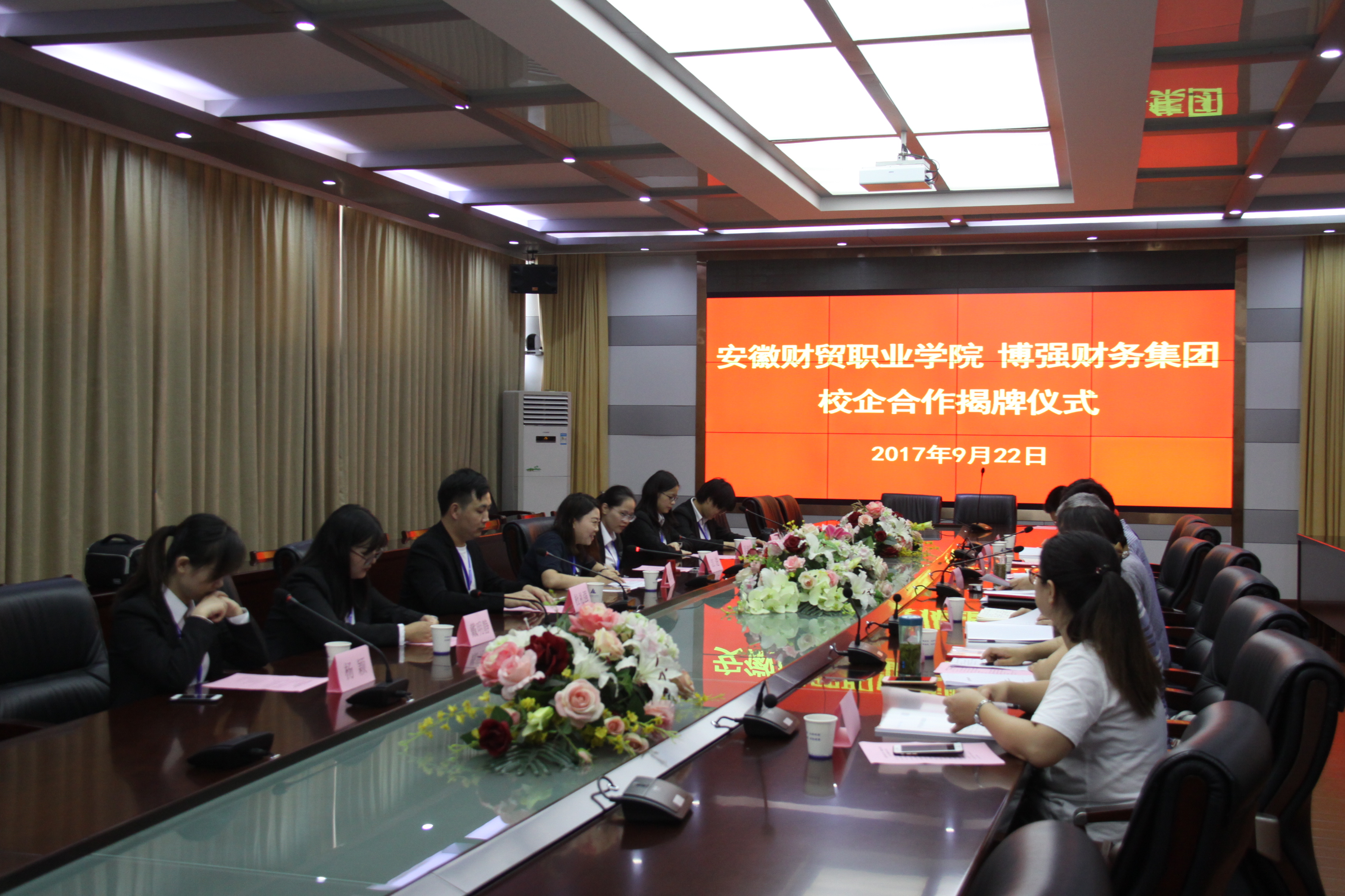 9月22日上午,合肥博强财务公司董事长余雪一行与茂荫财金学院在行政楼第四会议室举行校企合作揭牌仪式,校长助理吴晓光、邓庆安,茂荫财金学院副院长方春龙及财务管理教研室参加了此次揭牌。