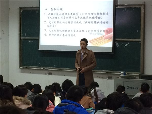 12月11日上午,中兴财光华会计师事务所项目税务部经理助理、我院税务专业毕业生王虎受邀走进2014级税务专业学生《税法》课堂,为同学们介绍了“假账识别”的相关知识。