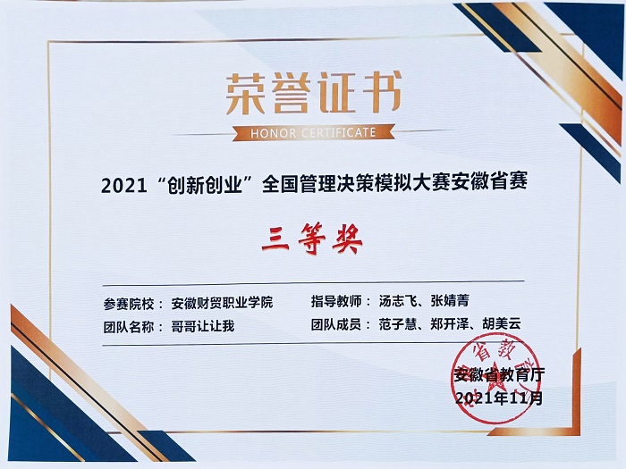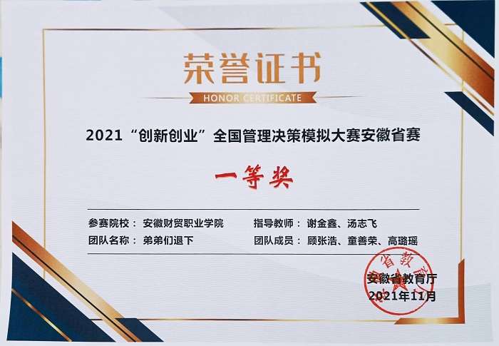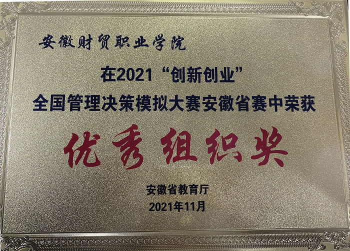 日前,由安徽省教育厅主办,安徽工业大学承办的2021年“创新创业”管理决策模拟大赛成绩公布,财会金融学院派出的三支队伍荣获一个一等奖、一个二等奖,一个三等奖,安徽财贸职业学院荣获“最佳组织奖”。