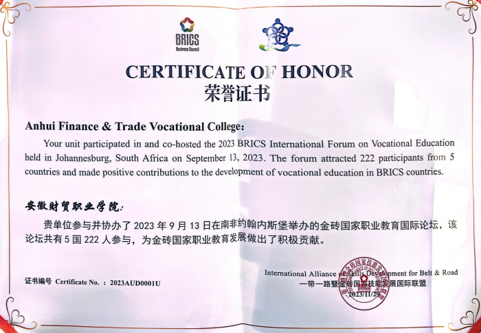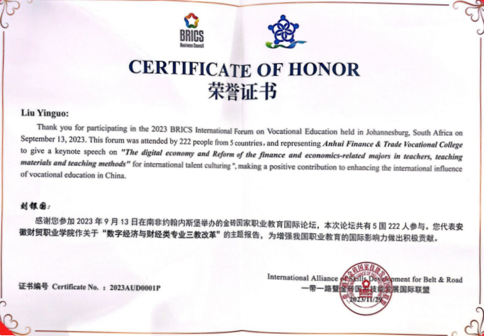 会上,国际联盟对我校协办的2023年金砖国家职业教育国际论坛作出表彰,颁发了荣誉证书;对学校党委副书记、校长刘银国在论坛中作的“数字经济与财经类专业三教改革”主题报告进行了褒奖,对我校为增强我国职业教育的国际影响力作出的积极贡献给予肯定和表彰。