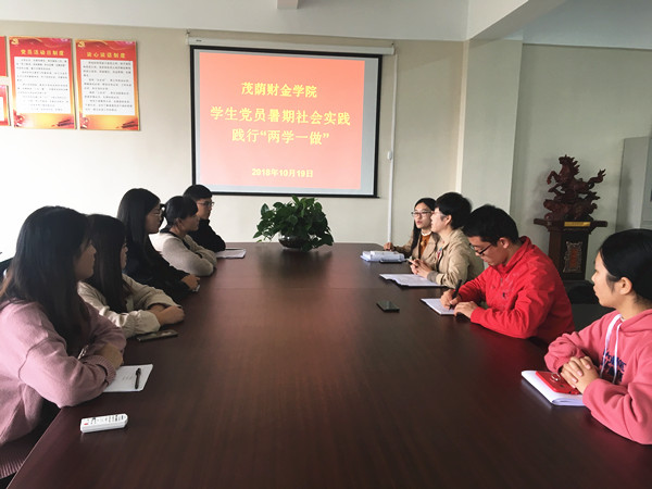 2018年暑假期间,茂荫财金学院学生党员立足专业、服务家乡,走基层进社区,真情服务家乡父老,以实际行动践行“两学一做”。10月19日中午,茂荫财金学院党总支副书记胡宏萱主持召开学生党员社会实践交流分享会。