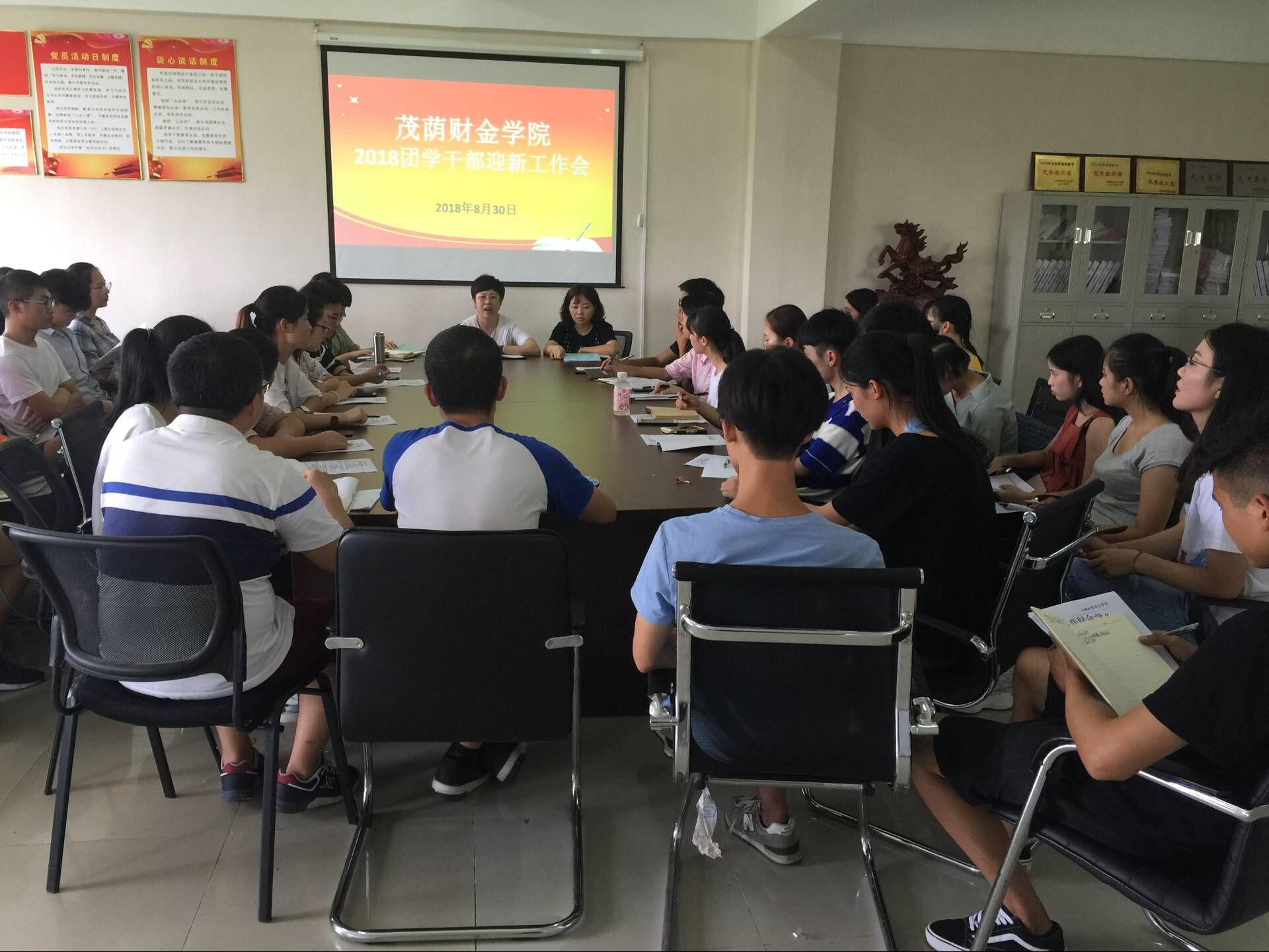 8月30日下午,茂荫财金学院在系办召开团学干部迎新工作会,专题研究部署迎新各项工作。茂荫财金学院党总支副书记胡宏萱、团总支书记梁惠婷、学生秘书李彧佳、专职辅导员童杰、姜奥出席了会议。2017级40名团学干部及5名预备党员参加了会议。