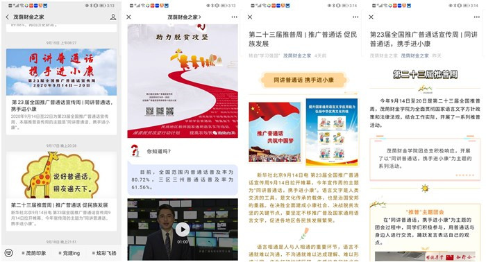 语言,是一个民族最动听的声音。文字,是一个民族最美丽的符号。语言文字,正是一个国家的灵魂。9月14日至20日是第23届全国推广普通话宣传周。为增强全体师生的语言规范意识和推广普通话的参与意识,推动语言文字和普通话宣传工作,茂荫财金学院开展了“同讲普通话,携手进小康”主题推普周系列活动。积极宣传,营造氛围。茂荫财金学院团总支通过微信订阅号“茂荫财金之家”推送多篇主题宣传内容。在互联网时代,同学们足不出户在第一时间就能够学习了解中华优秀传统文化,进一步坚定文化自信和文化自觉,全面提升茂荫学子以及全校师生的语言文字水平,形成线上线下互动联动,掀起全媒体学习宣传热潮。