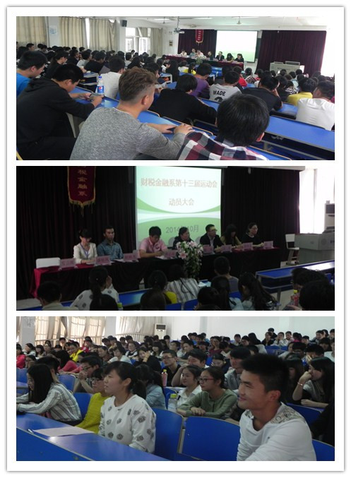 10月24日中午,财税金融系在5102教室召开学院第十三届运动会动员大会,为即将出征的175名运动健儿加油鼓劲。系党总支副书记徐明、教学秘书胡林杰、学生秘书韩正山、专职辅导员童杰出席大会。