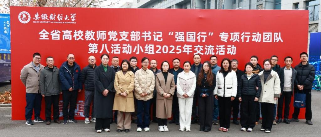 12月19日,安徽省高校“双带头人”教师党支部书记“强国行”专项行动团队第八小组活动在安徽财经大学龙湖东校区求真楼二楼报告厅举行。本次活动由中共安徽省委教育工委、中共安徽财经大学委员会主办,主题鲜明、内容充实,涵盖主题报告、经验分享、小岗村考察及研讨交流三大环节。