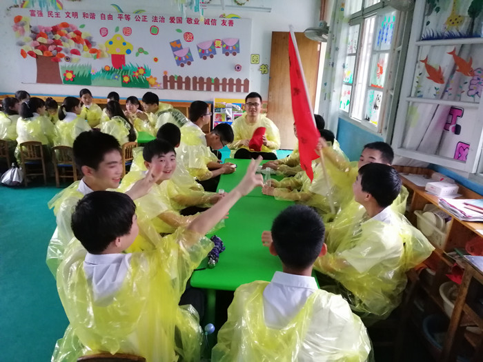 指导老师胡云芳带领学生来到了王茂荫故居杞梓里镇,与当地杞梓里中学的60名学生一起开展研学活动。同学们充当研学导师,带领当地学生设计营旗、创作口号,参加开营仪式。虽然当天歙县下起了大雨,但是同学们不畏艰难,认真敬业,顺利完成任务。