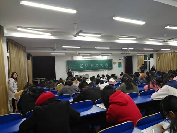 为了更好的传播法律知识,弘扬宪法精神,11月23日晚,雪岩贸易学院和茂荫财金学院联合举办宪法知识竞赛,来自7个学院共300余名同学准时到场参加了此次比赛。
