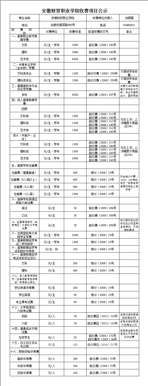 安徽财贸职业学院收费项目公示