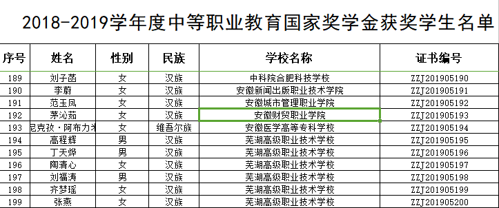 根据《财政部 教育部关于调整职业院校奖助学金政策的通知》(财教〔2019〕25号)和《教育部 人力资源和社会保障部 财政部关于印发〈中等职业教育国家奖学金评审暂行办法〉的通知》(教财函〔2019〕104号)规定,教育部、人力资源和社会保障部、财政部联合成立了中等职业教育国家奖学金评审领导小组,设立了中等职业教育国家奖学金评审委员会,按照客观、公平、公正的原则,对各省(区、市)、各计划单列市、新疆生产建设兵团教育部门和人力资源社会保障部门所属中等职业学校(含技工学校,下同),教育部直属高等学校所属中等职业学校报送的评审材料进行了认真评审。经评审确定,安徽财贸职业学院公共教学部高职1701班学习委员茅沁茹同学获得2018—2019学年度中等职业教育国家奖学金。在此表示祝贺!