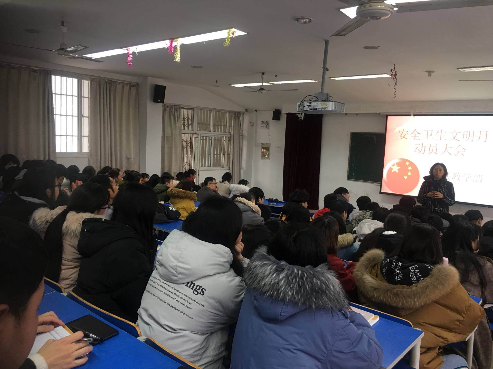 3月1日中午1时,公共教学部安全卫生文明月启动仪式于5102教室拉开帷幕,近200名学生参加了此次活动,公共教学部主任王静、副主任杨声以及各班级辅导员皆出席了活动。活动首先由学生管理秘书石冰宣读院学字〔2019〕20号文件的有关内容,就文件内容为同学们做了进一步的解读,同时号召同学们要按照文件的有关要求扎实推进,稳固落实。随后杨主任就安全卫生文明月的卫生评比细则及一票否决制等相关要求进行了更细致的讲解,并针对同学们关心的问题予以一一解答。活动的最后,王主任首先肯定了开学至今各班级寝室的卫生状况,同时也勉励各寝室在原有的基础上要不断进步,既要找出差距也要形成特色,要以安全卫生文明月为契机,不断提升公共教学部的班风建设。