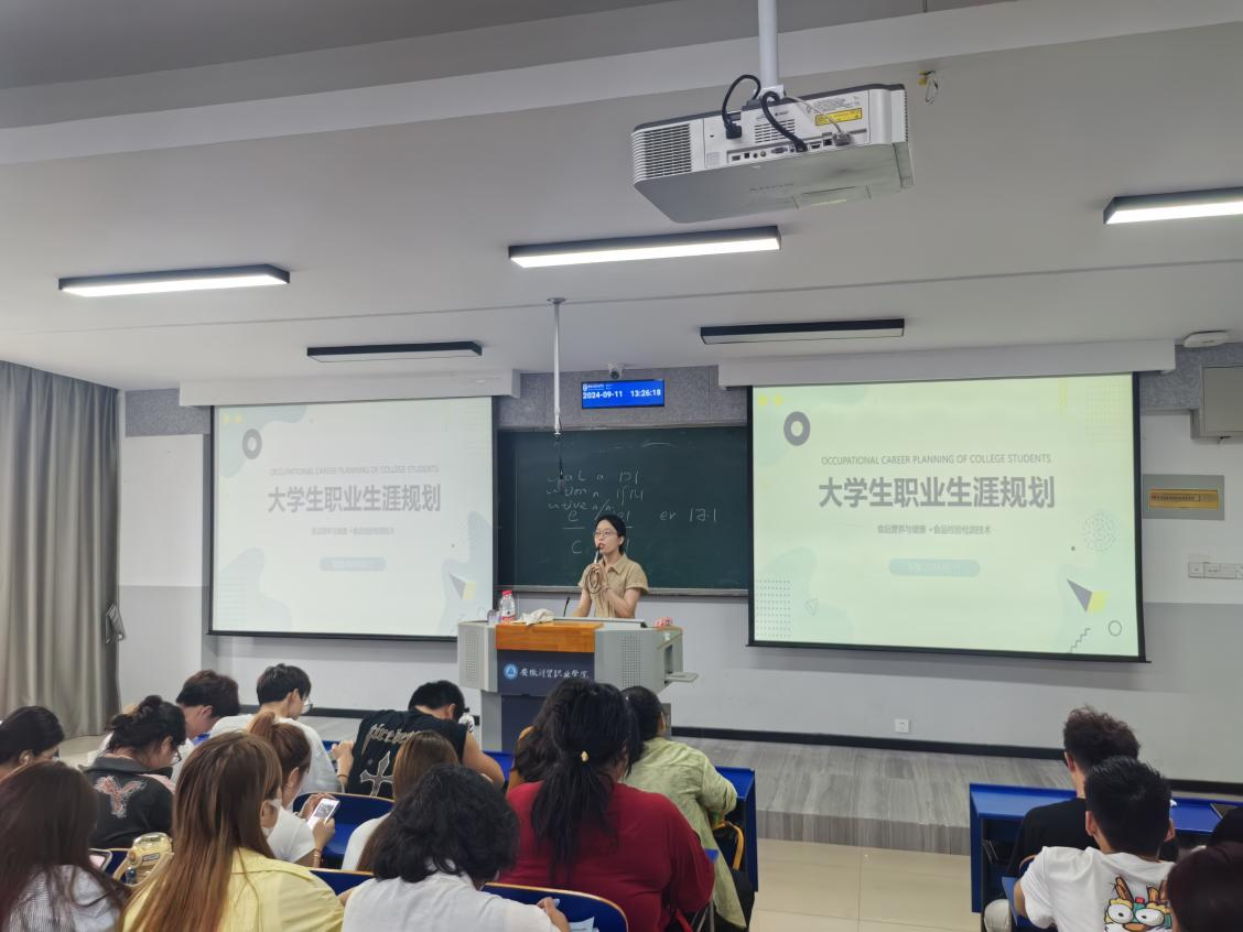 食品专业负责人刁欢教授从各专业的课程设置、培养目标、就业方向等方面为同学们进行全面的讲解。张盟老师为同学们做了详细的职业生涯规划,鼓励同学们不断地提升自己。本次活动还邀请到安徽邻几便利店有限公司人事经理李辉为同学们讲解行业现状并进行就业指导。