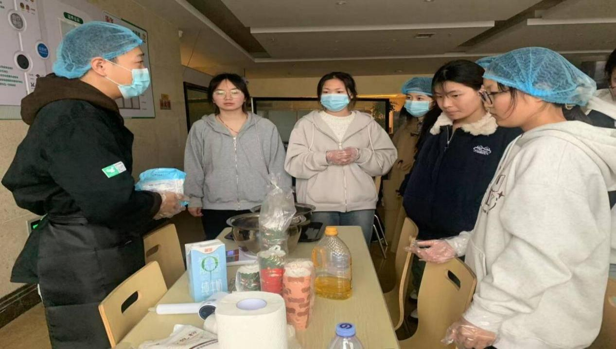 活动开始,来自校内24级食品专业的王梓睿同学详细讲解了低卡蔓越莓玛芬蛋糕的制作要点。从原料的健康选择,如用代糖替代传统蔗糖、以全麦粉混合低筋面粉降低热量,到制作过程中的关键步骤,如搅拌面糊时的手法与程度、烤箱温度和时间的精准把控,他都进行了细致入微的演示与说明。在实际操作环节,同学们热情高涨,分组协作,积极动手实践。大家小心翼翼地称量原料、搅拌面糊,再将点缀着蔓越莓干的面糊倒入模具,放入烤箱。等待蛋糕出炉的过程中,大家交流着自己对健康饮食的看法,现场氛围轻松愉悦。
