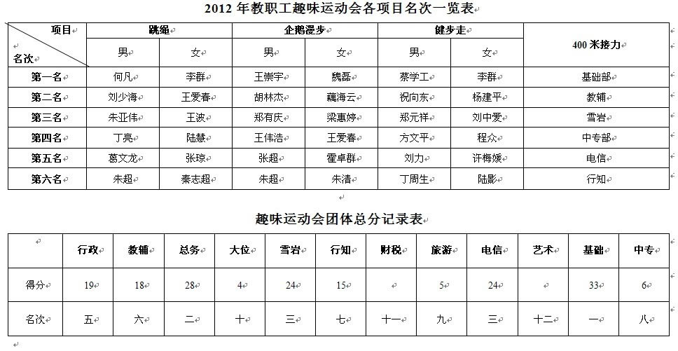 2012年教职工趣味运动会各项目名次一览表