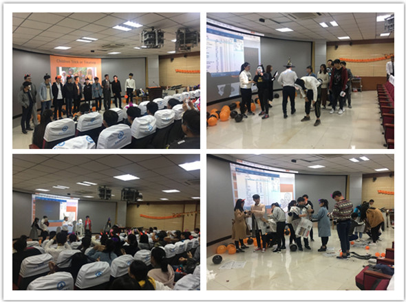 10月31日晚,国际交流中心在3D实训室举办万圣节文化体验活动。外教夏(Shahboz)和阿齐兹(Azizi)带领2017级中外合作专业的学生们一起体验了西方文化中的万圣节。 活动开始,学生们身着应景的服装、面具及面带妆容入场,外教夏用PPT介绍了万圣节的由来、各地庆祝方式,并与学生们分享了万圣节当天爱尔兰人的庆祝方式。外教阿齐兹带同学们开展了 “贴南瓜鼻”、“成为木乃伊”、“万圣节时装制作”、“水中取苹果”、“竞猜瓶中糖果”等经典游戏项目,现场气氛活跃,欢声笑语不断。