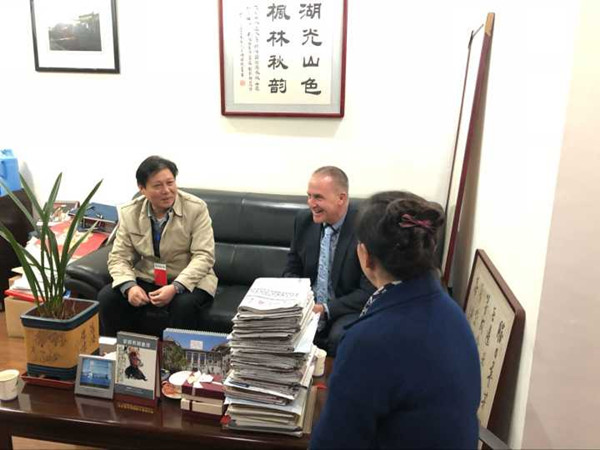11月30日下午, 阿斯隆理工学院商学院教授肖恩•康奈尔(Sean Connel)先生到访我校,为国际项目班学生开展讲座。 讲座开始前,肖恩先生拜访了副校长胡戴新,胡戴新代表学校欢迎肖恩先生的到来,希望他给学生们带来一场生动的讲座。肖恩向胡戴新介绍了阿斯隆理工学院商学院的课程体系及我校留学生的学习生活情况,并欢迎胡校长到阿斯隆理工学院访问。会谈结束后,国际交流中心负责人带肖恩先生参观了校园。