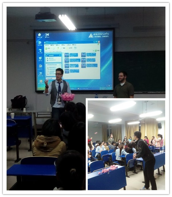 当天晚上,外教为同学们介绍了节日的来由以及当地人民的庆祝方式,并带领同学们一起进行了“掀纸杯”、“花样投篮”等有趣的游戏活动。欢乐的气氛感染了在场了的每一个人,师生亲密无间,欢乐共享。