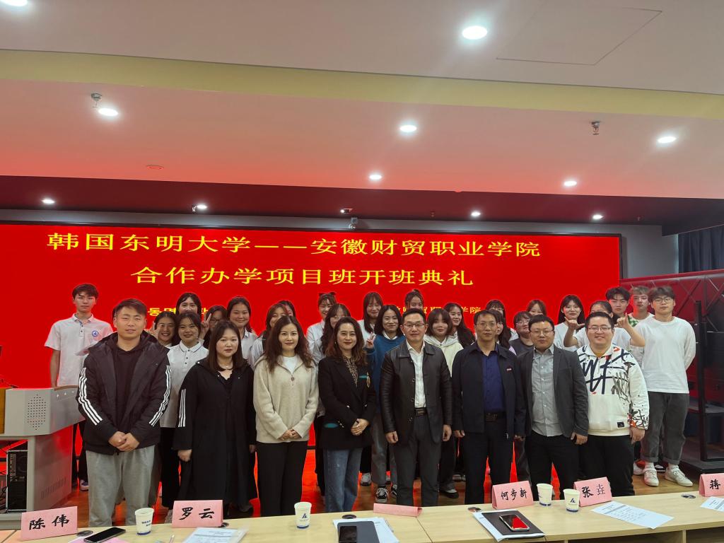 11月17日,韩国东明大学——安徽财贸职业学院婴幼儿托育服务与管理中外合作办学国际项目班开班典礼在A1003智慧实训室举行。典礼由公共教学部副主任陈伟主持,教务处处长王海龙、公共教学部党总支副书记何步新、教务处国际教育科、幼管2101班辅导员蒋臣与幼管2101全体学生现场参礼。