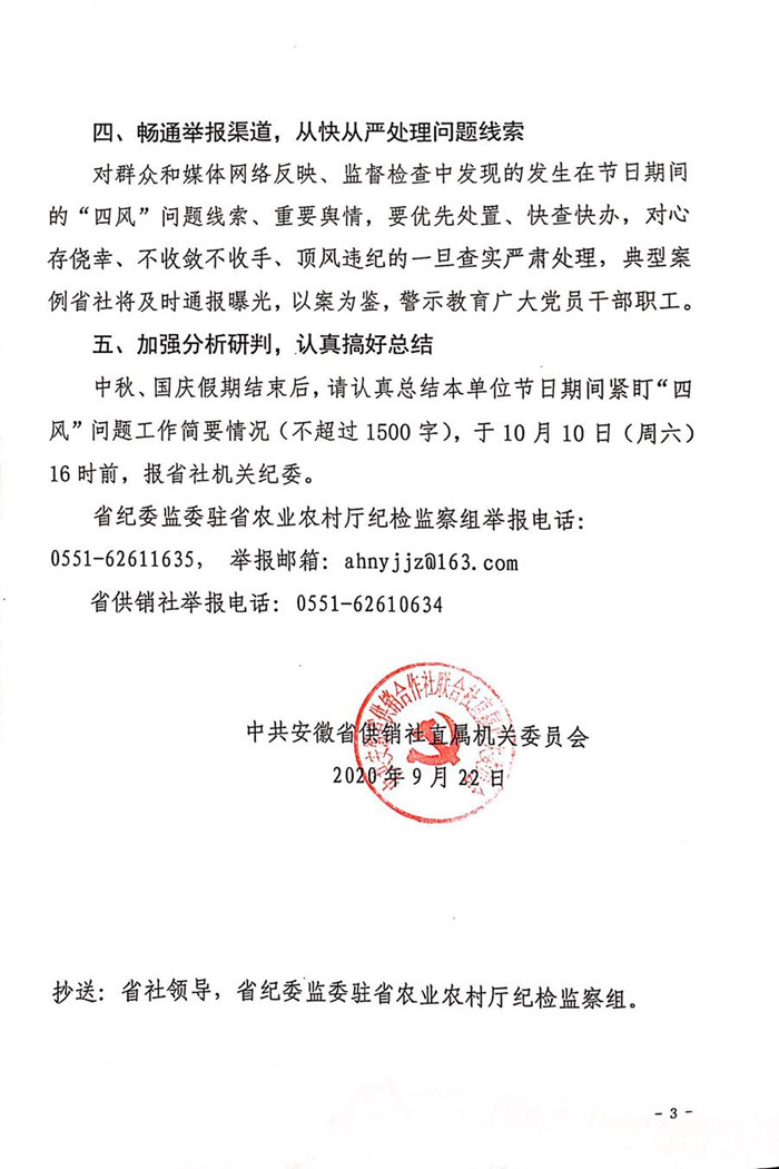 现将中共安徽省供销合作社联合社直属机关委员会《关于加强2020年中秋、国庆两节期间作风纪律工作的通知》转发给你们,请遵照执行。