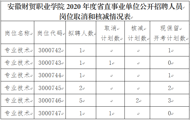 根据《关于印发2020年度安徽省省直事业单位公开招聘工作人员实施方案的通知》(皖人社秘〔2020〕96号)文件规定的程序及考生网络报名确认情况,经资格审查,部分岗位因达不到规定开考比例予以取消或核减拟聘人数,岗位取消和核减情况已上报安徽省人力资源和社会保障厅。岗位取消后,改报名人员的资格审查工作已完成。现将岗位取消和核减情况公告如下。