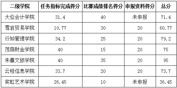 根据《关于举办安徽财贸职业学院第五届“互联网+”大学生创新创业大赛的通知》(院招字〔2019〕76号)之附件6《优秀组织奖和组织奖评审规则》相关规定,大赛组委会办公室分别根据任务指标完成情况、比赛成绩排名情况、申报资料上报情况三个方面对各二级学院的赛事组织工作进行了评审。现将各二级学院参评得分和评审结果予以公示。