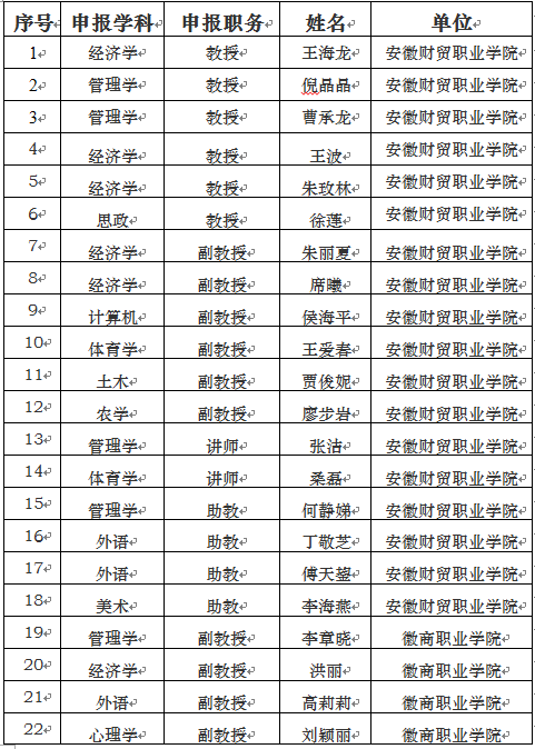 根据《安徽省教育厅 安徽省人力资源和社会保障厅关于印发< 安徽省高校教师职称评审权下放工作实施方案(试行)>的通知》(皖教人〔2017〕3号)和《安徽财贸职业学院2018年教师和实验技术人员专业技术职务任职资格评审实施方案》,学院于2018年12月8日~9日组织了2018年度安徽财贸职业学院教师和实验技术人员专业技术职务评审,同时也对委托我院评审的徽商职业学院、安徽国际商务职业学院、安徽绿海商务职业学院和安徽审计职业学院四所院校申报人员专业技术职务进行了评审。