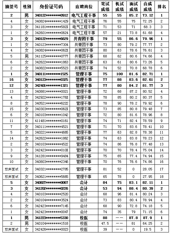 现将考生最终合成成绩予以公示,如无异议,最终会计岗位合成成绩前2名,管理干事岗位前3名,共青团干事、校医、电气工程干事各岗位合成成绩第1名的考生将进入体检、考察、录用等环节,请保持手机畅通,因故出现人选缺额的,将依据最终合成成绩排名,依次等额递补。感谢各位考生对学院工作的关注和支持。