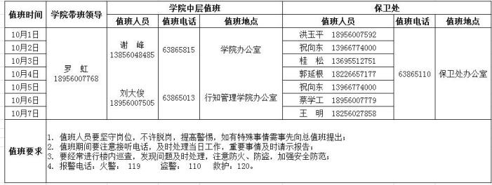 根据校历安排,学院2018年国庆节放假时间为10月1日至10月7日,9月29-30日上班(上周一、周二课),请做好假期值班、安全等工作。假期学院总值班表如下: