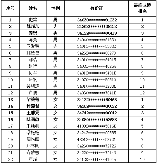 现将考生三项考核及最终结果予以公示,如无异议,最终合成成绩男生排前3名、女生排前4名(粗体字)的考生将进入体检考察、岗前培训和录用环节,请保持手机畅通,因故出现人选缺额的,将依据最终合成成绩排名,依次等额递补。感谢各位考生对学院工作的关注和支持。