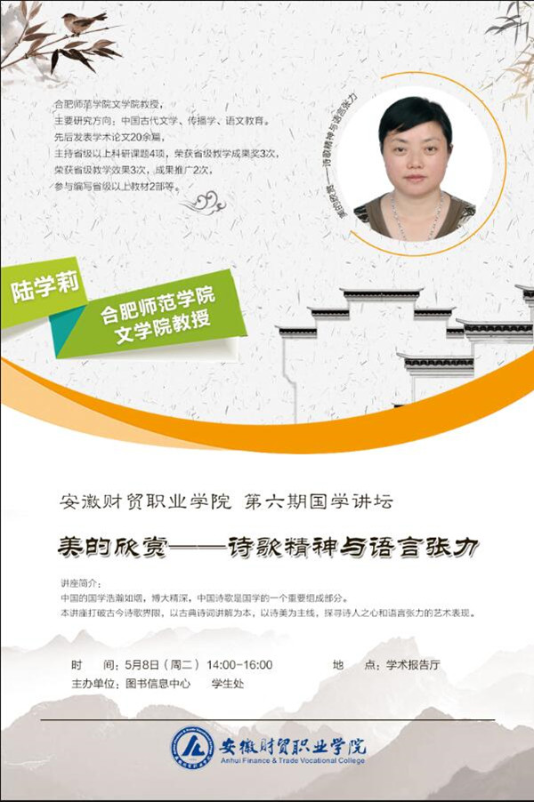 为弘扬中华优秀传统文化,促进青年学生自身素质综合提升,学生处与图书信息中心特别邀请合肥师范学院文学院教授陆学莉做客我院第六期国学讲坛,举办“美的欣赏——诗歌精神与语言张力”主题讲座。现将有关事项通知如下: