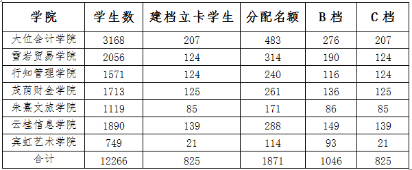 根据省教育厅分配我校2017-2018学年度国家助学金名额2696,其中建档立卡学生825人,须享受国家助学金最高标准A档资助;其余评定名额1871人,依据各学院专科层次学生数推荐评审名额如下: