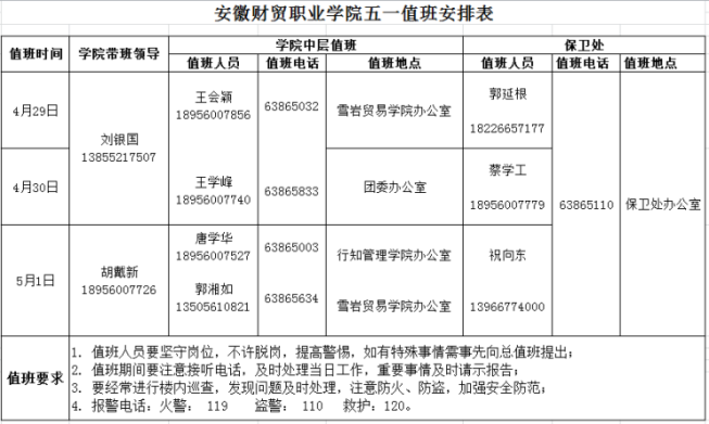 根据校历安排,学院2017年五一放假时间为4月29日至5月1日,2日上班、上课,请做好假期值班、安全等工作。假期学院总值班表如下: