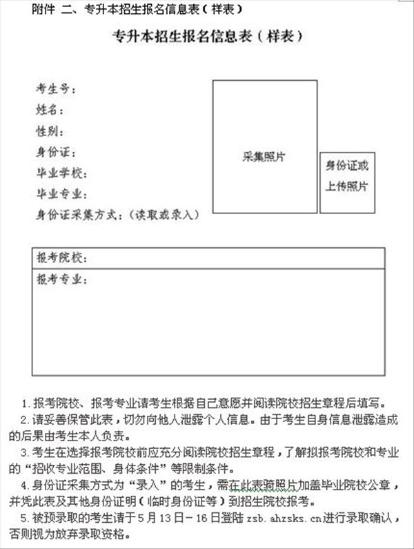 根据《安徽省教育厅关于印发安徽省职业院校升学考试改革试点方案(试行)的通知》(皖教办〔2014〕2号)和《安徽省2017年普通高校专升本考试招生工作操作办法》(皖招考函〔2017〕17号)的文件精神,学院将负责2017届毕业生参加专升本考试的报名,并在报名的同时进行考生照片采集、考生身份证信息的读取及考生资格审核。相关要求及提醒如下: