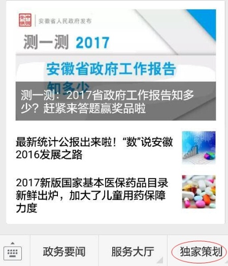 (2)点击“安徽省人民政府发布”微信公众号菜单栏“独家策划”→“答题测试”即可参与;