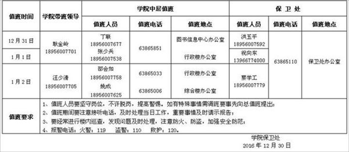 根据校历安排,学院2017年元旦放假时间为2016年12月31日至2017年1月2日,3日上班、上课,请做好假期值班、安全等工作。假期学院总值班表如下: