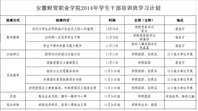 附件:安徽财贸职业学院学生干部培训班学习计划