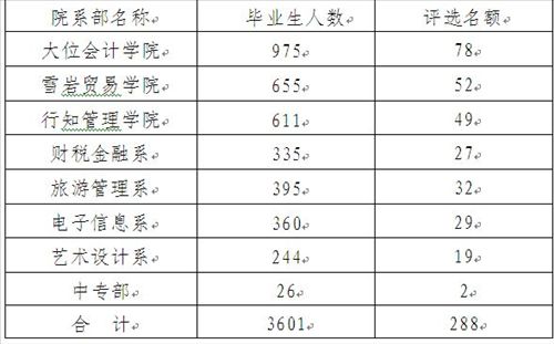 学院优秀毕业生按照毕业生人数的8%比例评选,2014年毕业生人数3601人,评选名额为288名。具体名额分配如下:
