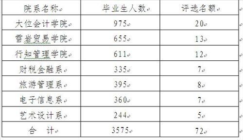 根据省教育厅文件规定,高职专科生评选比例按毕业生人数的2%掌握,原则上不得突破比例。我院2014年高职专科毕业生人数3575人,评选名额为72名,具体名额分配如下: