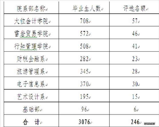 按照毕业生人数的8%比例评选,2012年毕业生总人数3076人,学院优秀毕业生评选名额为246名。具体名额分配如下: