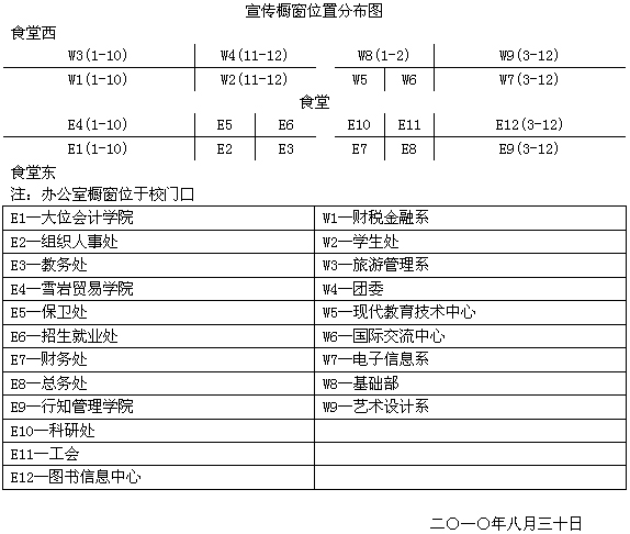 根据新一轮机构设置,现将宣传橱窗作统一调整划分(位置分布见下图),请于9月3日15时前完成内容更新。