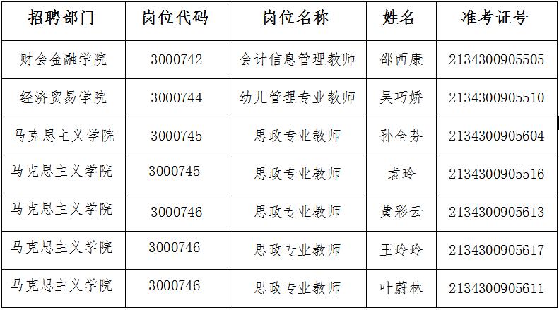根据省人社厅《关于印发2020年度安徽省省直事业单位公开招聘人员实施方案的通知》(皖人社秘〔2020〕96号)文件精神和《安徽财贸职业学院2020年度公开招聘工作人员专业测试及有关工作实施方案》工作要求,经网络报名、资格审查、报名确认、统一笔试、资格复审、专业测试、体检考察等程序,现将2020年度省直事业单位公开招聘拟录用人员名单予以公示: