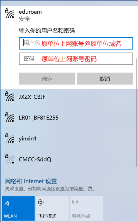 上网账号为联盟成员原所在机构的网络账号(“原所在单位上网账号@原单位域名”),密码为“原所在机构上网密码”例如:安徽大学来访我校人员,网络账号名user1,则输入user1@ahu.edu.cn和安徽大学上网密码后,即可在我校使用无线网络。
