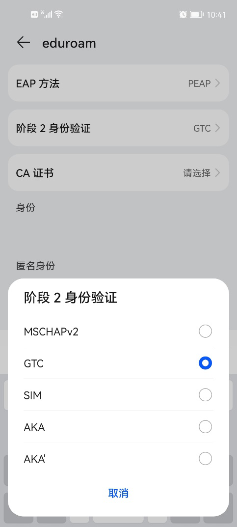 联盟成员单位已有校园网账号的用户,在安徽财贸职业学院校园WIFI无线网络覆盖范围内,搜寻无线网信号名称为“eduroam”的接入。