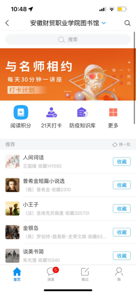 读者扫码或直接在应用商店下载“超星移动图书馆”APP,登录后在首页右上角输入邀请码“ahcmtsg”进入安徽财贸职业学院图书馆首页。点击“阅读积分”进入指定活动页面。
