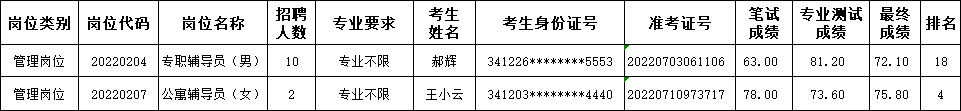 根据《安徽财贸职业学院2022年度编外聘用人员公开招聘公告》《安徽财贸职业学院2022年度编外聘用人员公开招聘工作实施办法》要求,按照考生最终成绩从高分到低分排名结果,按照1:1比例等额递补进入资格复审人员,现予以公布。资格复审合格人员将进入体检及考察政审阶段。