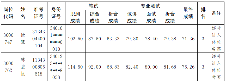 在学院2024年度省直事业单位公开招聘工作人员体检考察阶段,因考生放弃体检政审等原因,3000747专业技术岗位和3000762管理岗位分别缺额1人,根据《关于印发2024年度安徽省直事业单位统一笔试公开招聘工作人员实施方案的通知》《安徽财贸职业学院2024年度省直事业单位公开招聘工作人员专业测试及有关工作实施方案》要求,按照考生最终成绩从高分到低分排名结果,按照1:1比例等额递补进入体检考察人员,递补考生信息如下。