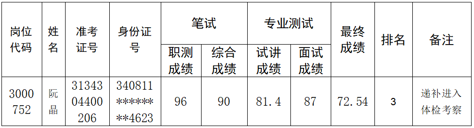根据《安徽财贸职业学院2024年度省直事业单位公开招聘工作人员专业测试及有关工作实施方案》要求,因入围300052专业技术岗位的考生自愿放弃,按照规定,在同岗位报考人员中,依据考生最终成绩从高分到低分排名结果,按照1:1比例等额递补进入体检考察人员,递补考生信息如下。