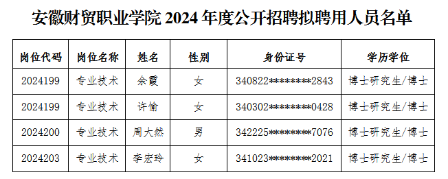 根据《安徽财贸职业学院2024年度公开引进事业编制高层次人才(博士)公告》有关规定,经组织报名、资格审查、专业测试、体检、考察和工作平台查询征信等环节,现将安徽财贸职业学院2024年度公开引进事业编制高层次人才(博士)拟聘人员进行公示。
